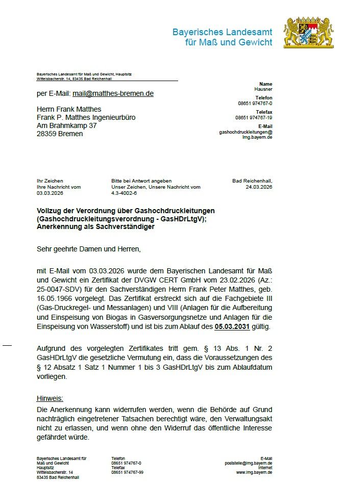 - Meine behördliche Anerkennung gemäß § 11 der Verordnung über Gashochdruckleitungen wurde durch das Landesamt für Bergbau, Energie und Geologie (LBEG), Clausthal-Zellerfeld und das Bayerische Staatsministerium für Wirtschaft, Landesentwicklung und Energie, München ausgesprochen.